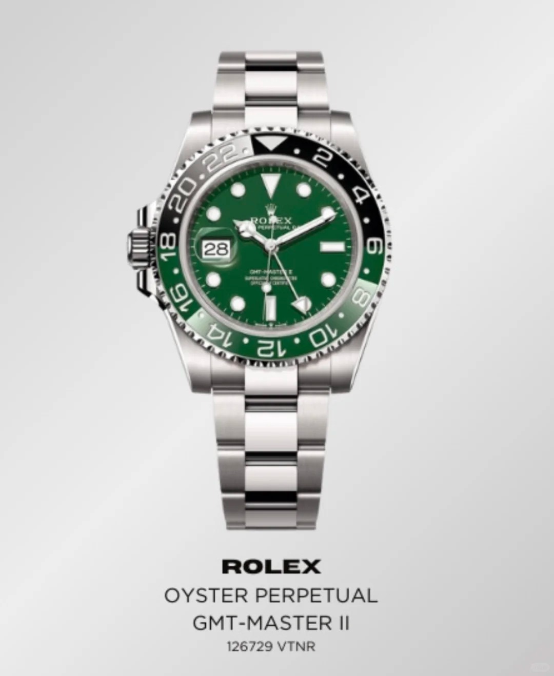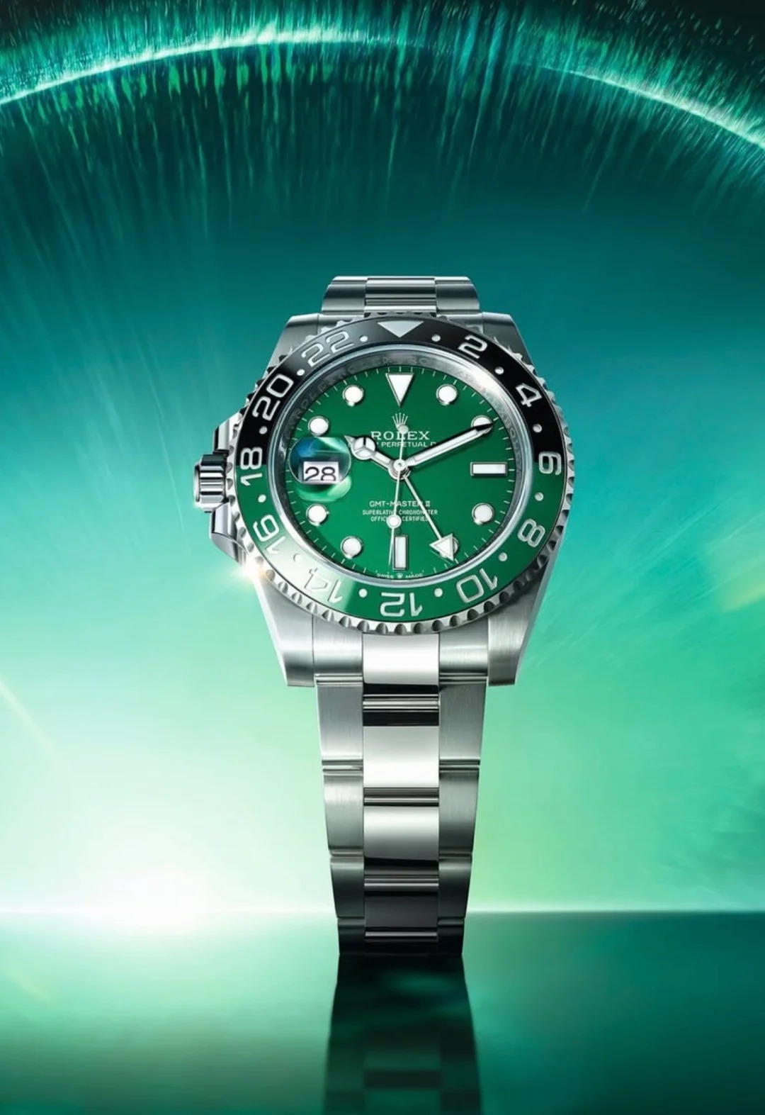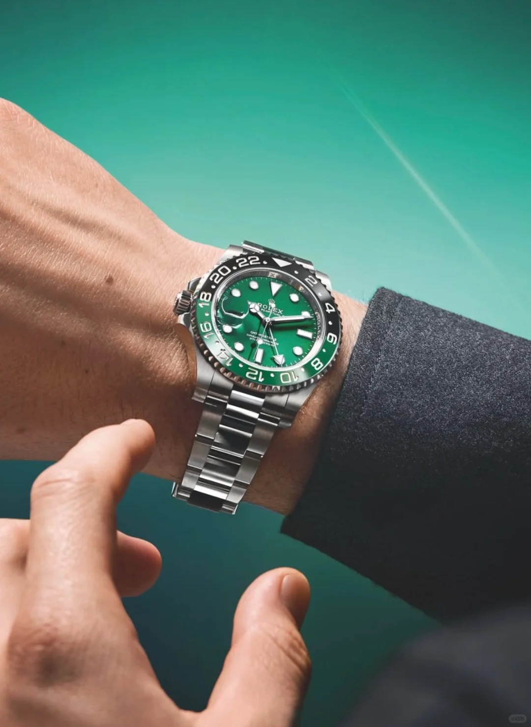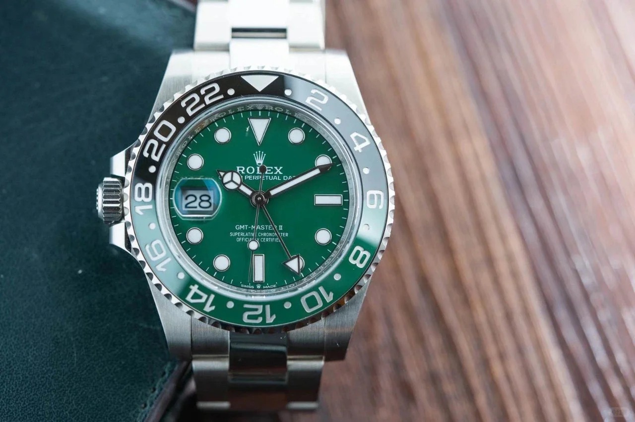 The Sprite bezel of the Rolex Greenwich series adopts a left-handed (left crown) design, with a green and black two-color ceramic bezel. The color transition of the bezel is clear, similar to the refreshing feeling of Sprite!